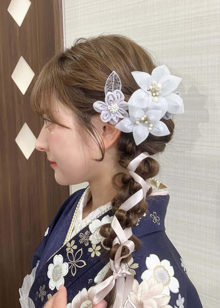 人気の「編み下ろし」スタイルに、前髪に動きを加えたり、花やリボンの髪飾りでアレンジを加えました。